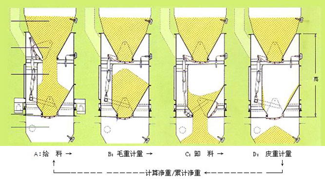 | 物料由上料仓经给料门进入给料段(图A),当达到预先设定的每秤重量时,给料门关闭,进行毛重计量(图B);毛重计量完毕后气动放料门打开,将物料卸入下料仓(图C);称量斗放空后,放料门关闭,进行皮重计量(图D),得出物料净重值后进行累加,同时开始下一称重循环。当累加值达到所需的称重总量时(接收/发放),称量过程自动停止。 |